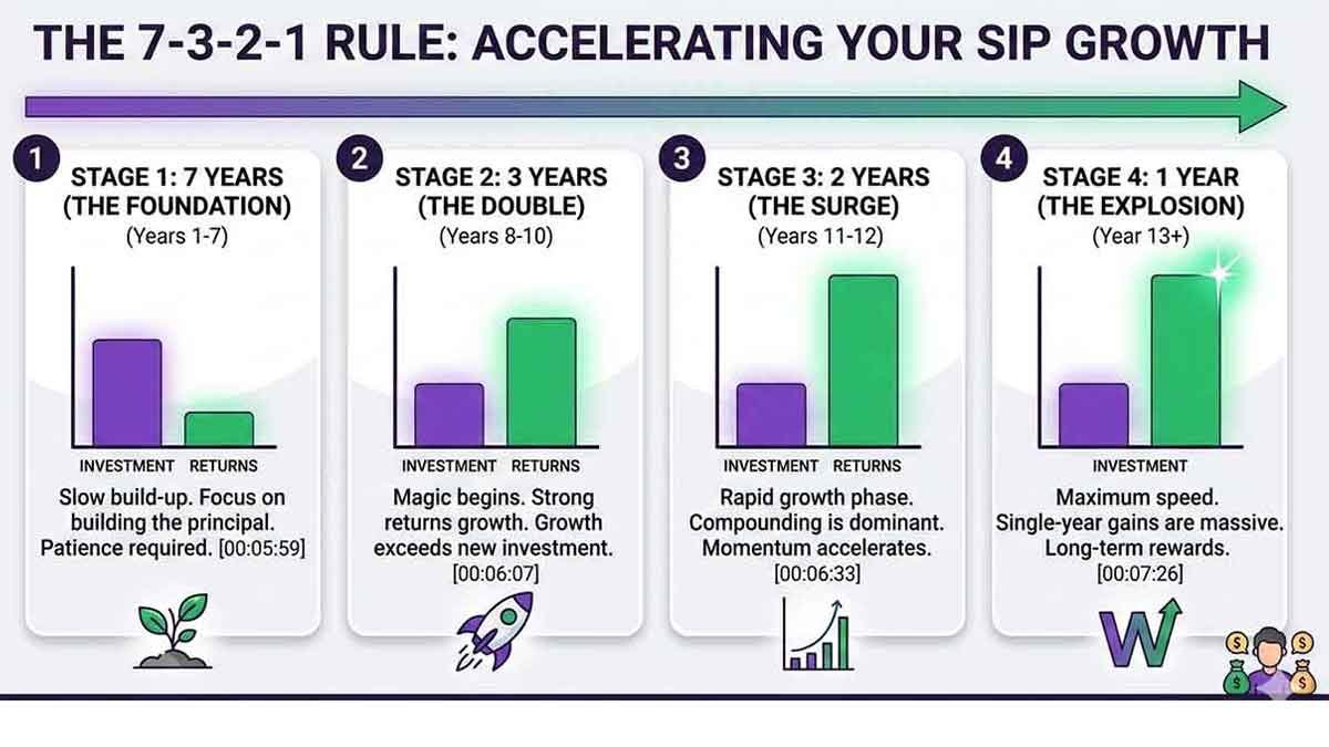 The 7-3-2-1 rule explains how wealth grows faster over time due to compound interest. The idea is that the first seven years are mostly about building the base of your investment. In the next three years, the corpus may grow much faster and can nearly double. In the following two years, the growth can accelerate even more, and after around twelve years, the increase in just one year can sometimes be greater than the growth seen in several earlier years combined.